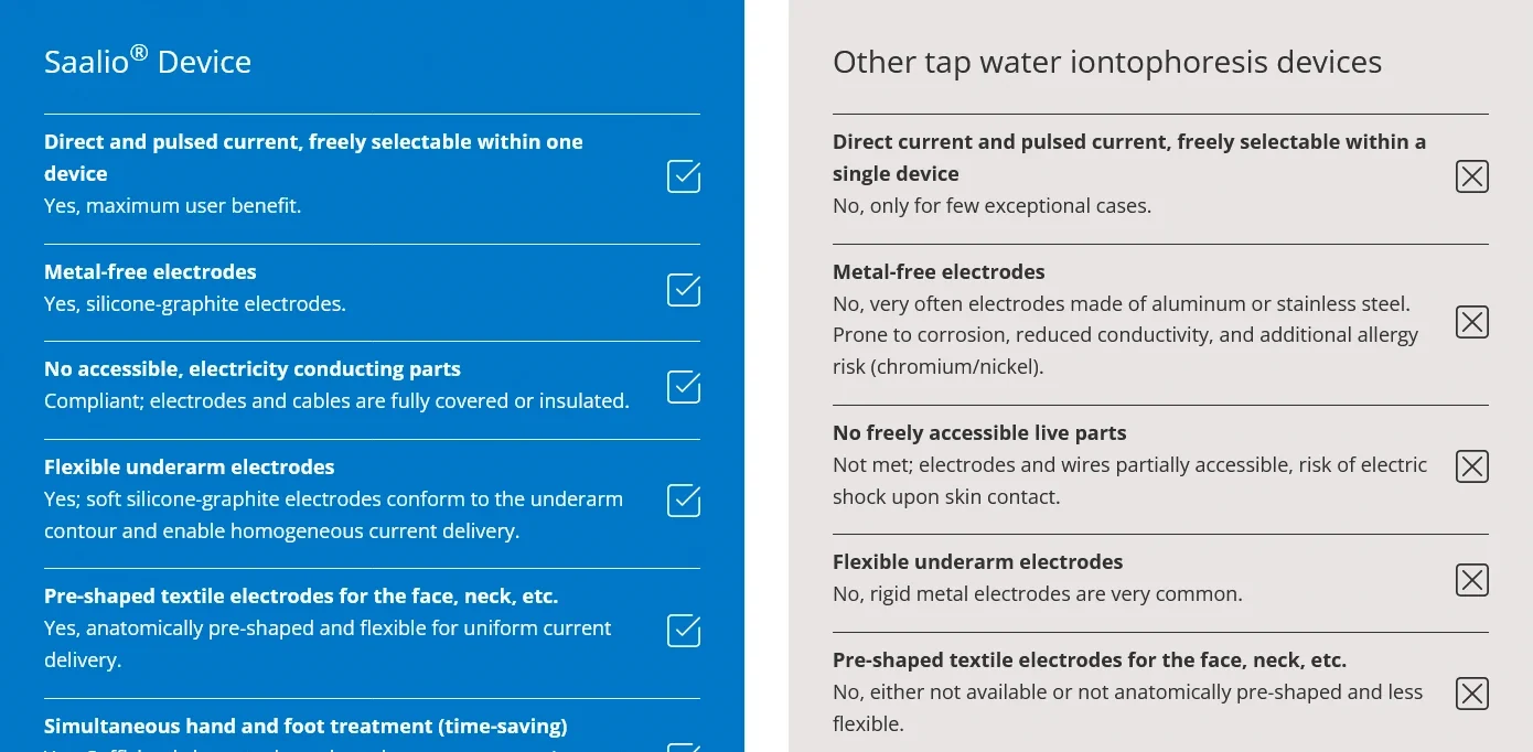 The Saalio® devices and electrodes allow treatment of a wide range of body areas. Hands, feet and armpits are the most common areas treated with tap water iontophoresis. The Saalio® device is therefore available in two versions: