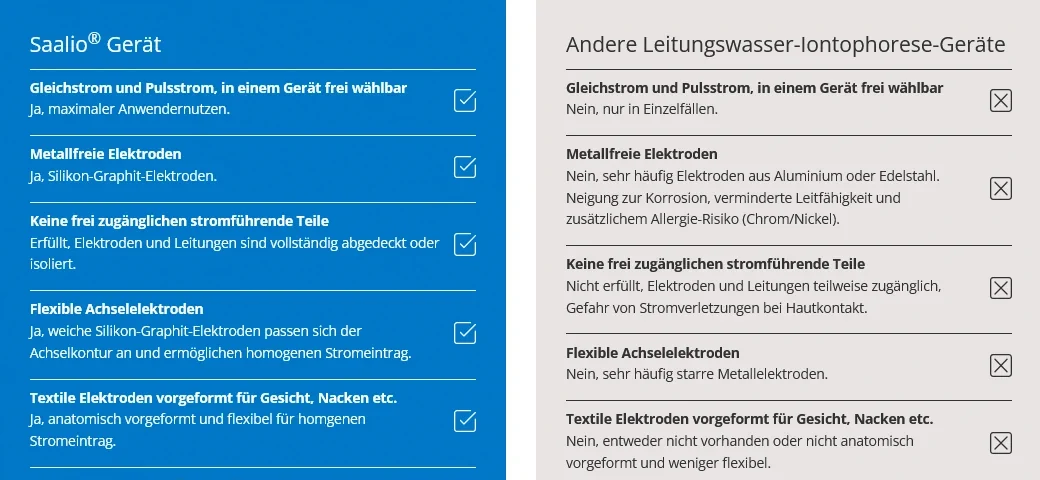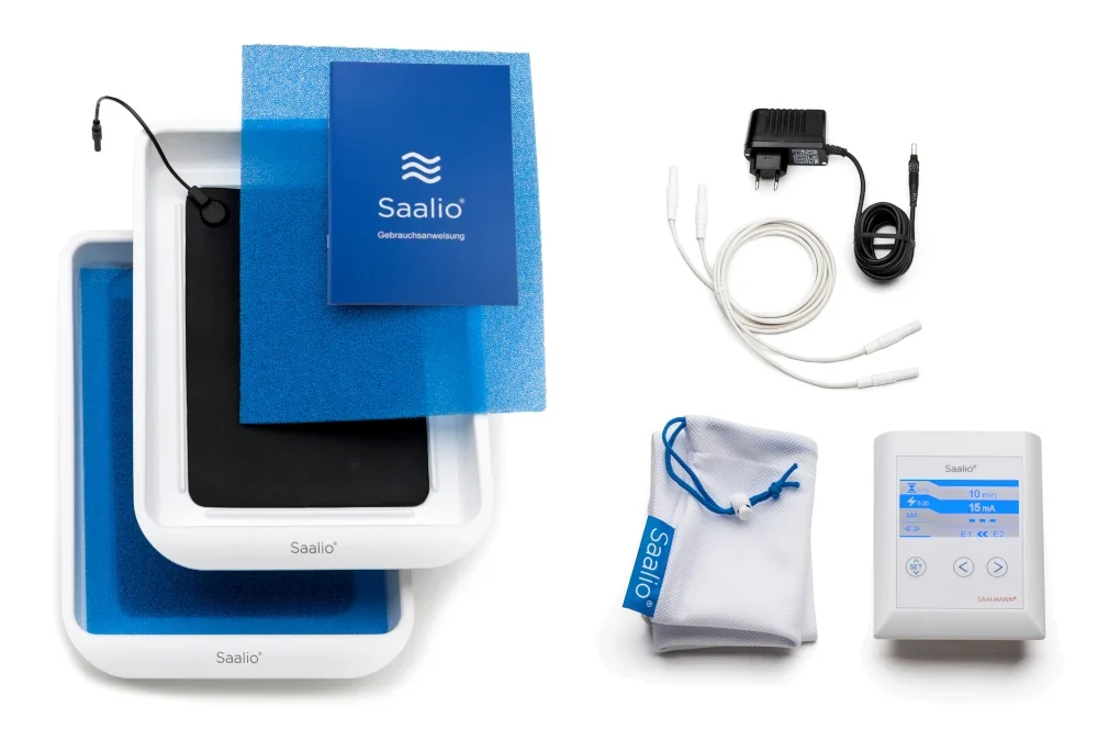 Die Saalio® Geräte und Elektroden erlauben die Behandlung an besonders vielen Körperstellen. Hände, Füße und Achseln sind die häufigsten Körperstellen, die mit der Leitungswasser-Iontophorese behandelt werden. Das Saalio® Gerät wird deshalb in zwei Ausführungen angeboten: